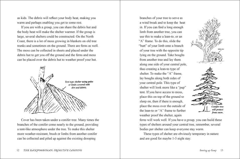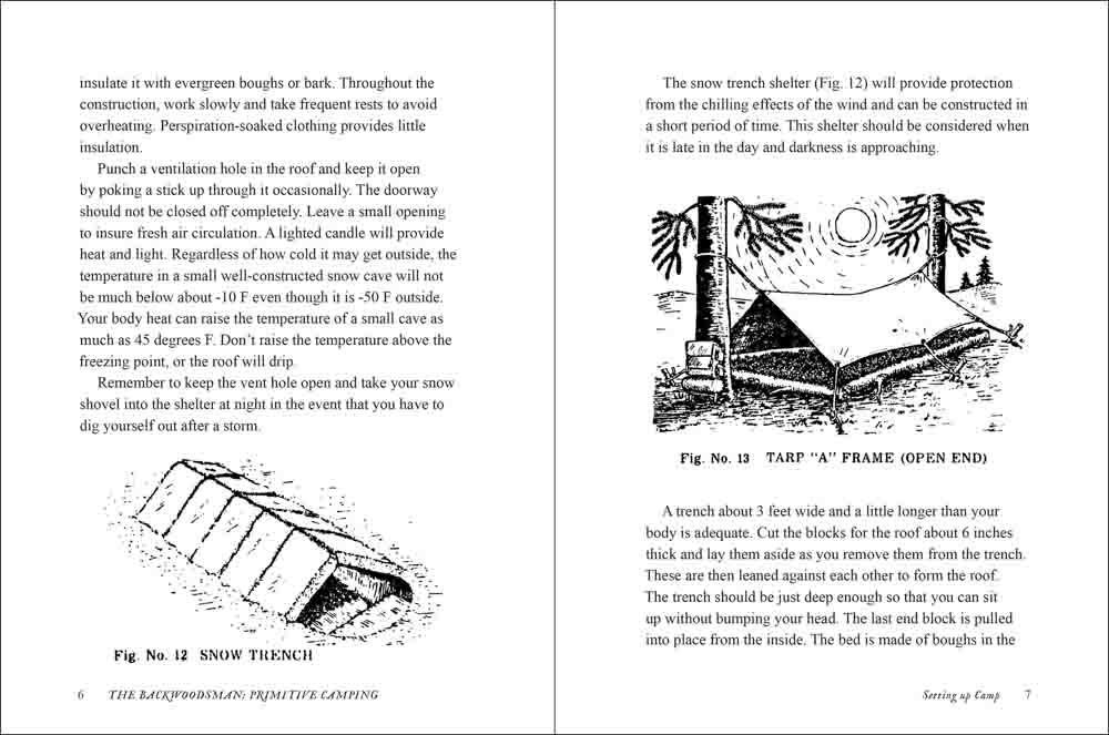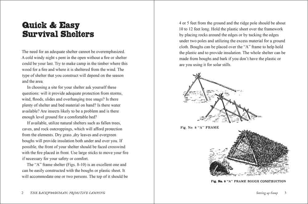 • Instructions for shelters, camp setup, cooking, tools, and other outdoor skills