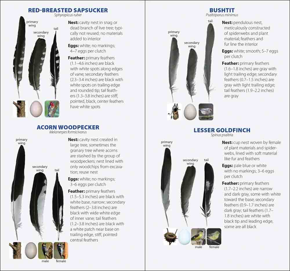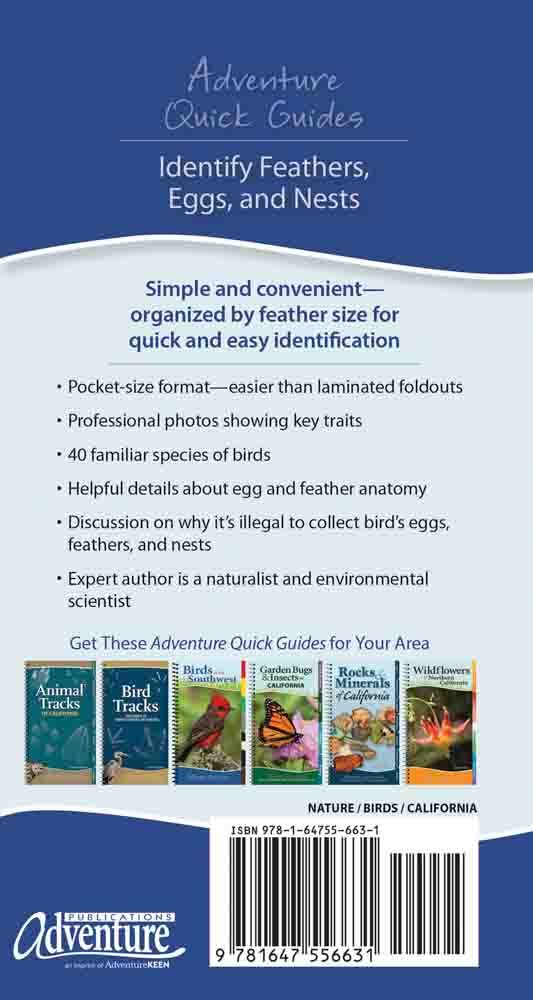 The detailed photographs cover 40 species: backyard birds like the Anna’s Hummingbird, gamebirds like the Gambel’s Quail, and waterbirds like the Mallard. Each entry includes information about the bird’s eggs, nest, and feathers. Plus, you’ll appreciate basic information about egg anatomy, feather anatomy, and why it’s illegal to collect bird eggs, feathers, and nests.