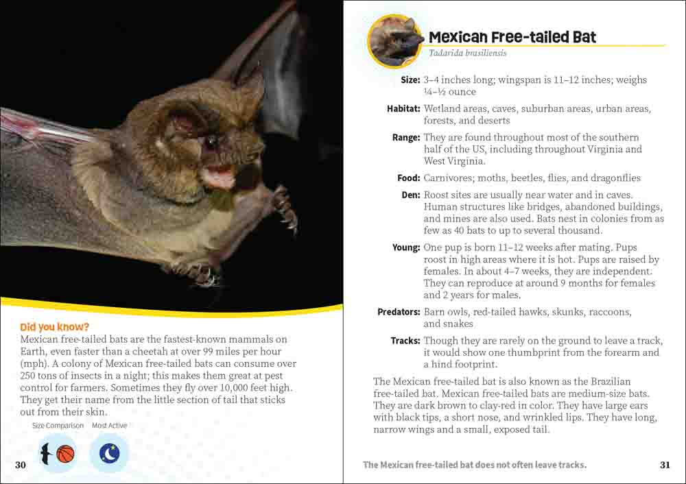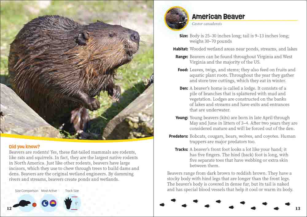 Each species is showcased in a professional-quality photograph that’s paired with such neat-to-know details as habitat, range, and preferred food sources. Illustrations of the critter’s tracks complement the information, and a “Did You Know?” paragraph provides fascinating trivia worth sharing with family, friends, and teachers. Critters of Virginia & West Virginia includes important-to-know mammals, birds, reptiles, and amphibians.