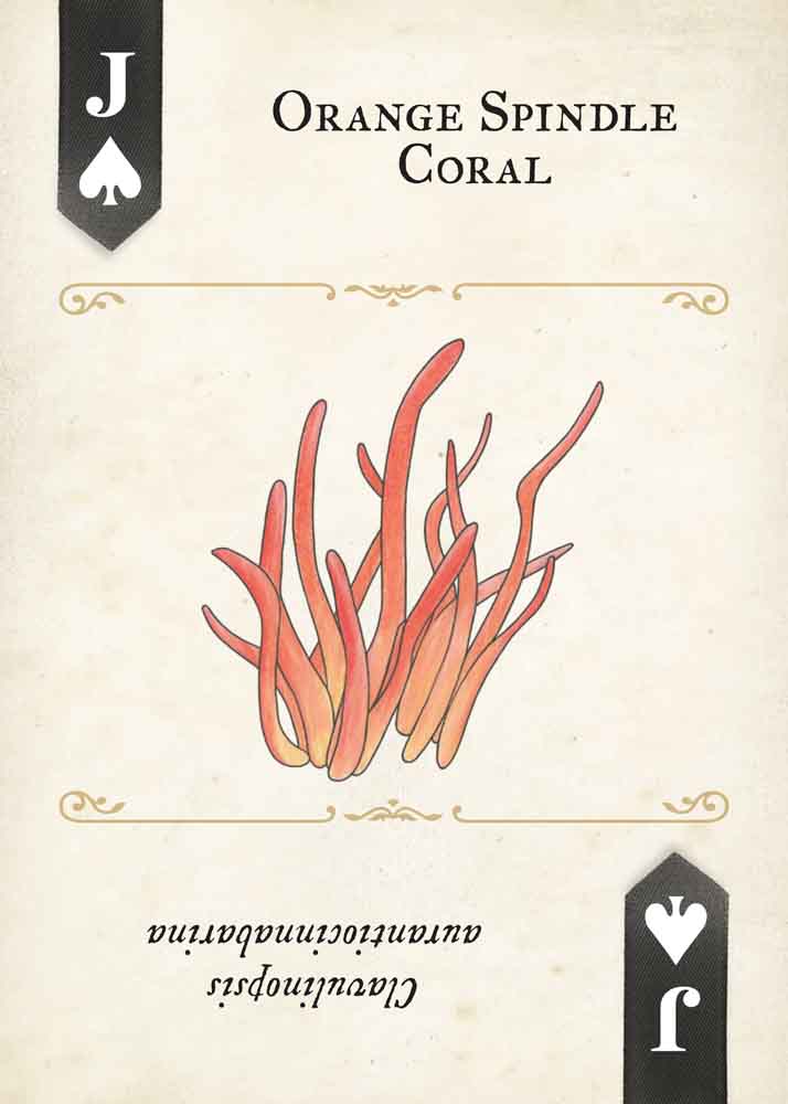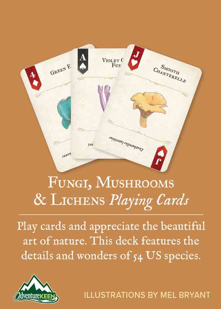 Fungi are among nature’s most essential and enchanting organisms, and the Fungi, Mushrooms & Lichens Playing Cards showcase their diversity, beauty, and ecological importance. Featuring the colored-pencil artwork of illustrator and naturalist Mel Bry, each card presents a different North American species of fungus, mushroom, or lichen—meticulously rendered to highlight unique shapes, textures, and colors. From delicate coral fungi to otherworldly cup mushrooms, Mel’s illustrations capture the quiet significance of these vital life forms. The artwork encourages players to pause, look closer, and discover the wonder in nature’s hidden details.