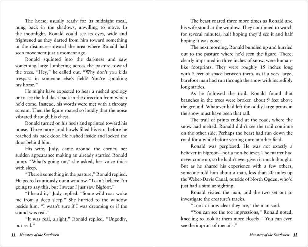 A mysterious beast preys upon animals at a popular zoo. Trapped on an island, two men are stalked by a dragon-like animal. A soldier is attacked by a large, hair-covered creature outside a guard station. Two men ride into a forest on horseback and capture the most famous video footage of Bigfoot ever recorded. The Southwest’s history includes several unimaginable encounters with legendary creatures. This collection of “ghost stories” presents the creepiest, most surprising tales of monsters in the states of Arizona, California, Nevada, New Mexico, Oklahoma, Texas, and Utah.