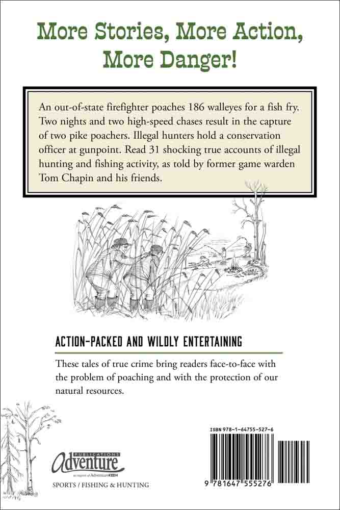 An out-of-state firefighter poaches 186 walleyes for his department’s fish fry. Two nights and two high-speed chases result in the capture of two pike poachers. Illegal hunters lead a conservation officer into the woods and hold him at gunpoint. If you thought Poachers Caught! was exhilarating, get ready for the sequel! Tom Chapin, a Minnesota game warden for 29 years, was cussed at, chased, shot at, and nearly run over. He has enlisted the help of his colleagues and friends to present 31 harrowing new accounts in More Poachers Caught! Read about some of the most memorable poachers who were ever caught—and some who got away.