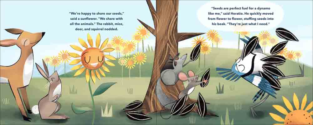 Horatio is a proud blue jay who loves to show off, but his aerial acrobatics make him hungry. When he spots a group of animals eating from a field of sunflowers, he decides to join them. The generous flowers happily offer Horatio some of their seeds, so Horatio eats and eats and eats. He doesn’t stop until just one sunflower seed remains. What will Horatio find when he returns to the field next year? How will he make amends for the harm he has caused?