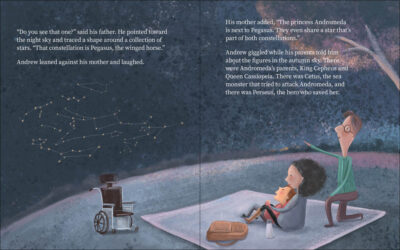 Andrew Moore is not like other children. He doesn’t talk or run or jump. But he loves to smile and laugh—and go on the most wonderful outings! When he soars into the night sky to meet the constellations, his new friend Andromeda is taken by a sea monster. Andrew must team up with Pegasus, the flying horse, to help Andromeda. The boy isn’t as fast as Pisces, as powerful as Aries, or as brave as Perseus. How will he save the princess and bring happiness back to the kingdom?